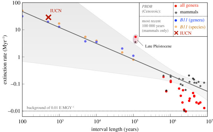 1) «Alcuni studi hanno dimostrato che i tassi di estinzione recenti sono più rapidi dei tassi di estinzione di sfondo documentati nei fossili, ma i tassi di estinzione possono superare lo sfondo anche al di fuori delle estinzioni di massa.»
